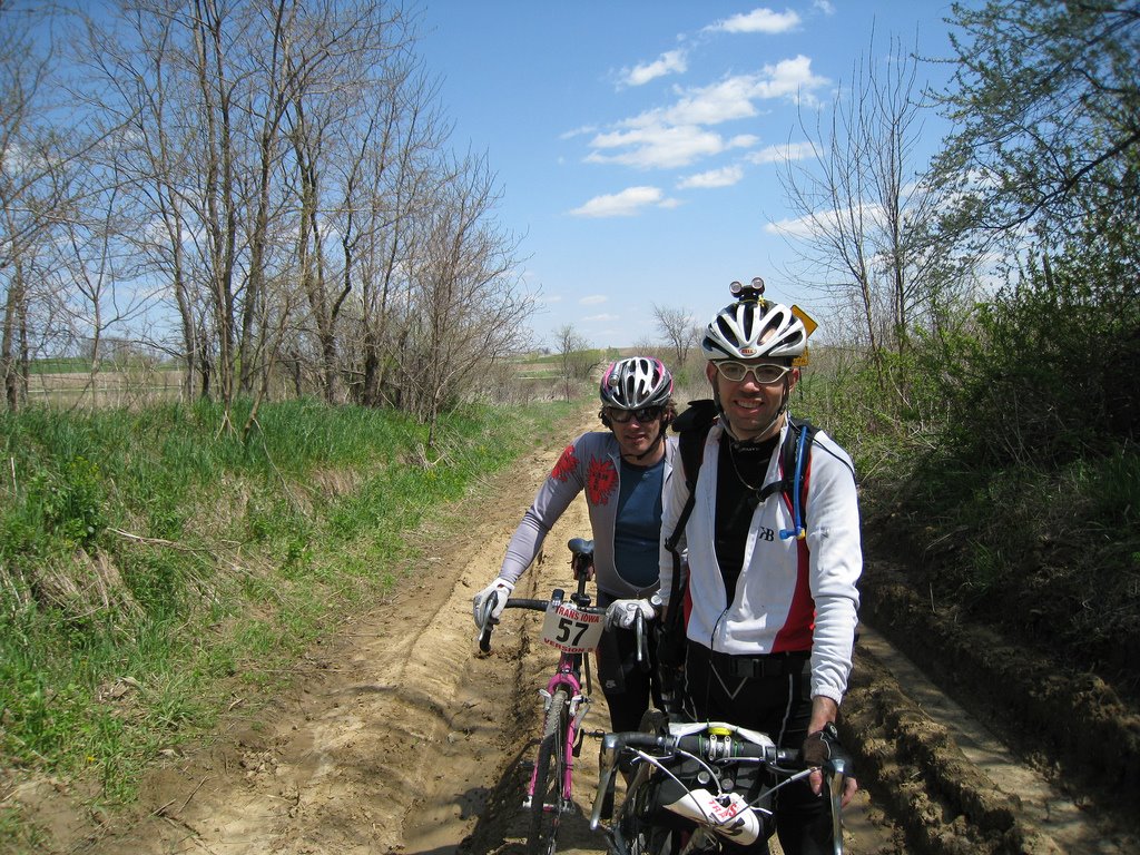 At some point we hit a pretty muddy road and I see Charlie Tri. He says his rear der. is AFU and he is converting his bike to a single speed. I offer some assistance but it’s apparent that this is a one man job. I decide maybe this a good Kodak moment and snap his picture. We roll off together just as the chase crew comes along and envelopes us. Charlie’s bike just didn’t want to cooperate with his three goals. The chain didn’t want to remain in the gear he had chosen. I found out later he broke his chain many more times before his ordeal was over.