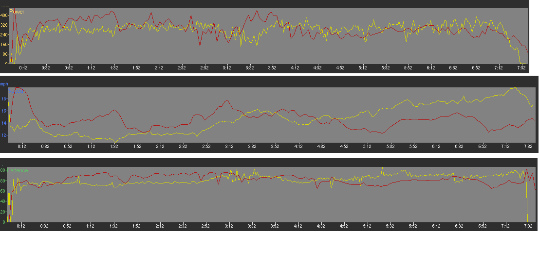 Mid graph Cadence– Yellow cadence is more consistent and actually increases during the last portion of the climb. Red trails off again mainly because I stood up to accelerate to as I was getting popped. Standing usually has a slower cadence.