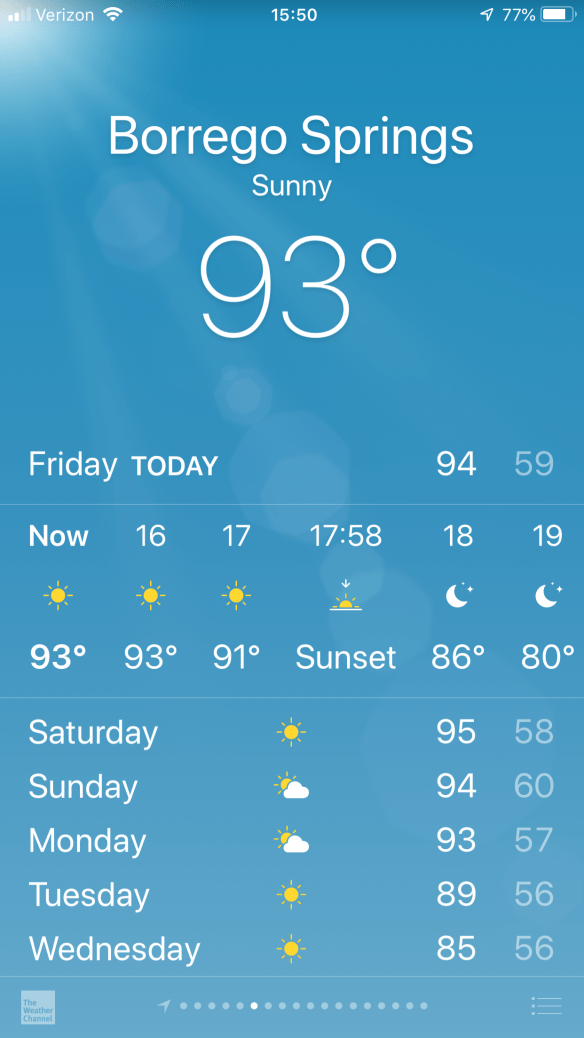 Montezuma Grade is tough at any time in a ride but especially so with 100 plus miles ad about 8,000 feet of climbing on your legs. The forecast for Borrego Springs is a high of 95F. But the heat coming off the pavement can raise the ambient temperature where you are riding by an additional 10F degrees. Of course as our luck would have it we are riding on the hottest day of the week through Borrego Springs and Puama Valley with a cooling trend starting on Sunday.