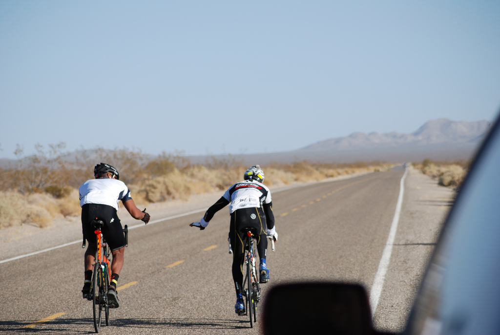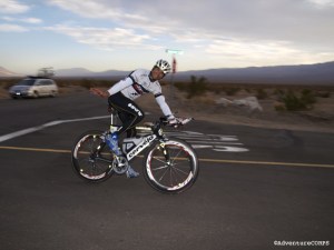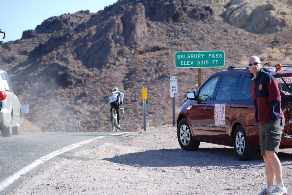 However, Mr Murphy, of Murphy’s law fame, had other ideas. My crew vehicle had a blow-out on the descent off the Trona Bump. Luckily it wasn’t in the twisty part but it still must have been scary for them. So here I am down the road quite a bit looking behind me for my crew and I don’t see them. Nevertheless, I kept the pace medium to high maximizing the terrain and the tailwind to my advantage. After some time another crew vehicle pulls alongside me and offers me a bottle. They tell me what has happened to my crew and give me a bottle to help sustain me until my crew is up and running.