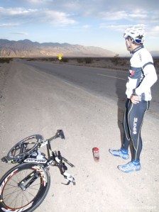 As I’m doing my calculations, the race director pulls up alongside and asks me about my crew vehicle. I explain the situation and almost in synch we confirm to each other official race time and the importance of the 6 o’clock hour. I had already made the left turn onto Panamint Valley Rd which then leads to the right turn on Hwy 190. A few miles into Panamint Valley Rd it was 6pm and I pulled over. It pained me to see racers pass me as I was sitting on the side of the road healthy, willing and able to ride