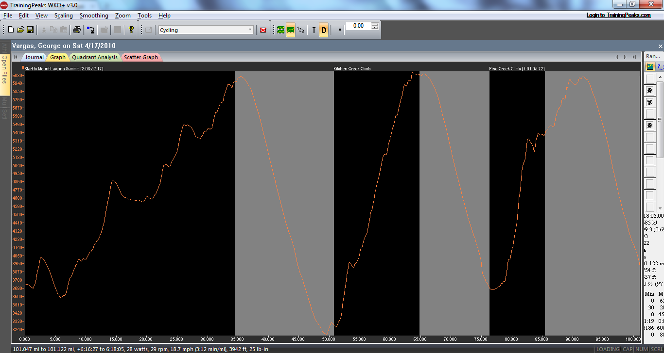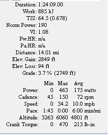 I have always been curious what the Towne Pass climb would be like from Stovepipe Wells. I thought about Steve Born and his double 508 and how he felt on this monster of a climb. The stats are daunting 17 miles and 5,000 feet of gain. What’s more is the sustained sections over 8% and I would estimate sustained sections over 9%. I was climbing in a 53/39 and 11-23 cassette and found myself standing much more than I like to. It was/is a very hard climb. I kept an eye on my Garmin 310XT and found it to really accurate. Every time I passed an elevation sign the elevation on the Garmin was REALLY close. I am very comfortable with the elevation data I received Sunday from my Garmin.