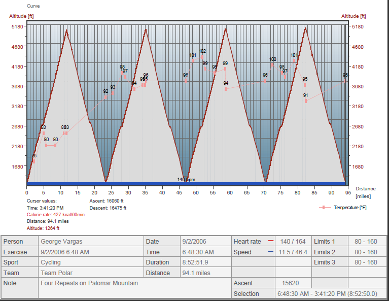 It is early in my preparation for the Furnace Creek 508 but I wanted to see what my form was like. I set out on Glendora Mountain Road with a short warm-up and then went for my Personal Record (PR) of 44 minutes. I felt fine during the climb. I looked at my power numbers compared to my heart rate and once again I noticed they were lower than usual. I have been participating in CVAC sessions and I believe that has a lot to do with it. More on CVAC later. I was only 12 seconds off my PR. The result is very promising since it is only May and my PR was set in late August when I am in much better form. the other reason my result is good is that it comes at the end of eight workout training week and almost 19 hours on the bike. Below is the graph of my ascent of Glendora Mountain Road.