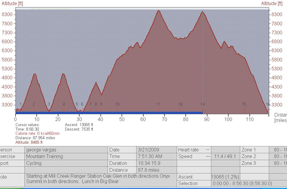 Onion Valley is one hard climb. Just look at the chart from mile 3 to the top at almost mile 13. It stays in the 7.5% to 10% grade range for almost 10 miles!! With the only exception being when it pops up and over 10% grade. Onion Valley gains over 5,000 feet in those hard miles.