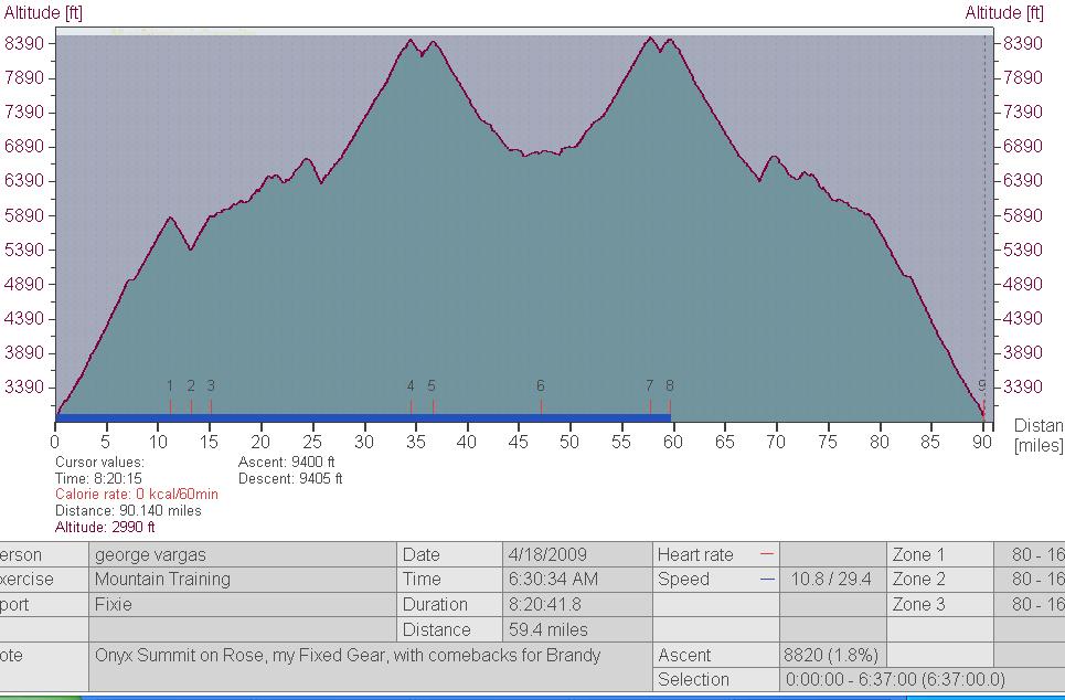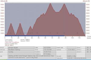 6 hour mountain training ride. 78 miles with 7800 feet of climbing. High temperature while I was still riding was 105F. Personal Best Onion Valley Rd (1:47). Partial climb of Horseshoe Meadow.