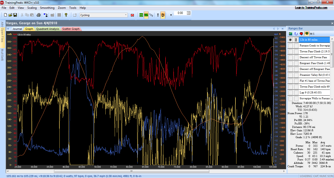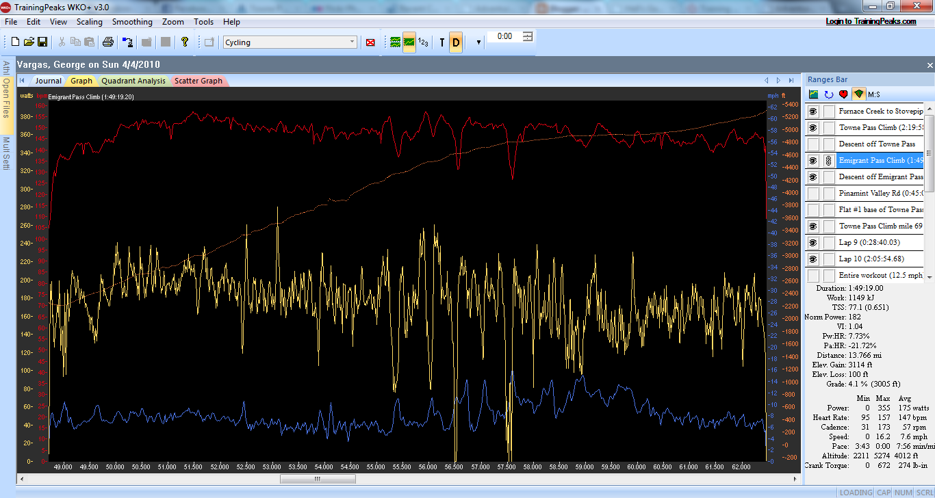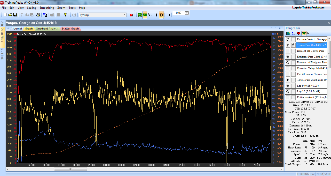 I have always been curious what the Towne Pass climb would be like from Stovepipe Wells. I thought about Steve Born and his double 508 and how he felt on this monster of a climb. The stats are daunting 17 miles and 5,000 feet of gain. What’s more is the sustained sections over 8% and I would estimate sustained sections over 9%. I was climbing in a 53/39 and 11-23 cassette and found myself standing much more than I like to. It was/is a very hard climb. I kept an eye on my Garmin 310XT and found it to really accurate. Every time I passed an elevation sign the elevation on the Garmin was REALLY close. I am very comfortable with the elevation data I received Sunday from my Garmin.