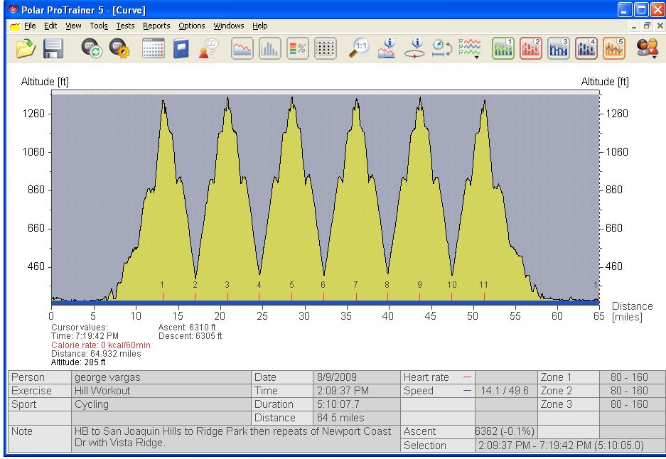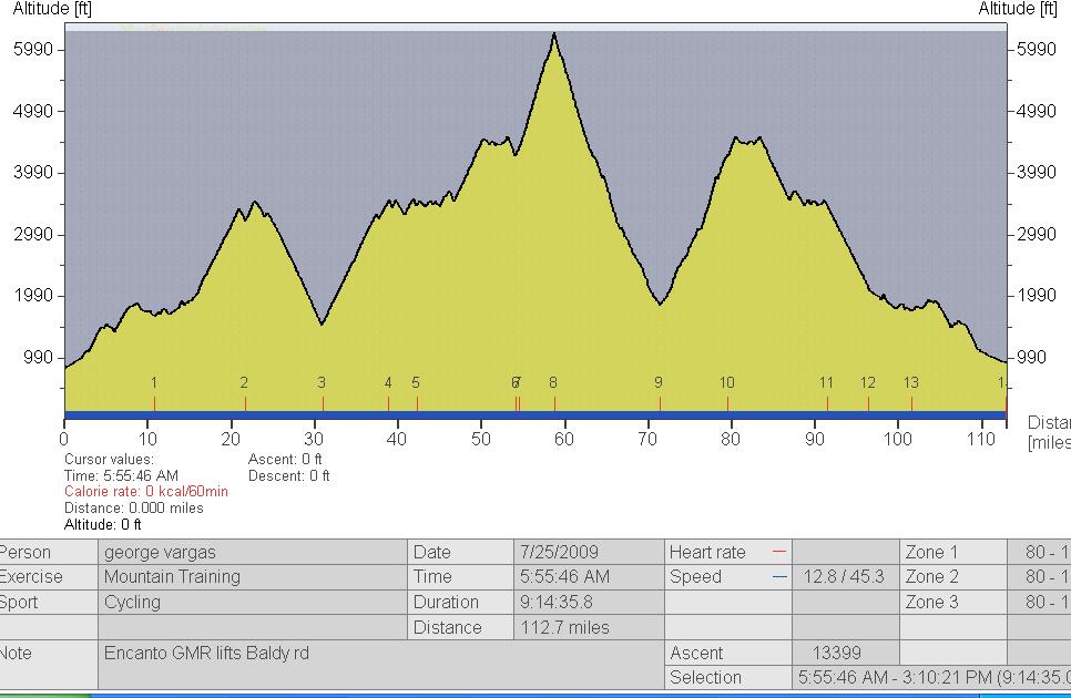 On 9/17 I climbed Onion Valley Rd to a Personal Record (PR) of 1 hour 44 minutes. It’s a 13 mile climb that gains over 5,000 feet in one solid shot. There are no flat spots or dips in this climb which makes this an extremely hard climb. Take for example Mount Palomar — after climbing a 5 miles you get a 3/4 mile flat section before beginning the final 6.7 miles at 7% to the summit. Or Mosquito Flat where you have a .9 mile dip 8 miles into the climb and a couple sections of fairly gently grades. Or Ancient Bristlecone/White Mountain were about 8 miles into the climb you have a 1 mile flat section before continuing on White Mountain Road to the 10,000 foot summit.