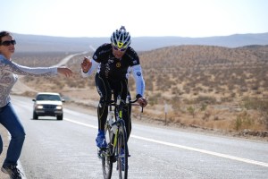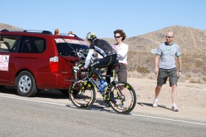 As I’m doing my calculations, the race director pulls up alongside and asks me about my crew vehicle. I explain the situation and almost in synch we confirm to each other official race time and the importance of the 6 o’clock hour. I had already made the left turn onto Panamint Valley Rd which then leads to the right turn on Hwy 190. A few miles into Panamint Valley Rd it was 6pm and I pulled over. It pained me to see racers pass me as I was sitting on the side of the road healthy, willing and able to ride