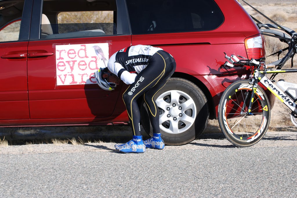 At Furnace Creek Time Station I spent a few minutes chatting with Blackbird and eating a turkey sandwich. We talked about the wind conditions and the time splits of other racers. My crew meanwhile filled the space saver spare tire with air. The tire blowout, the flat spare and the damage to the rental vehicle concerned me way too much. I eventually was able to shut it out but I do remember ruminating over it far too much.
