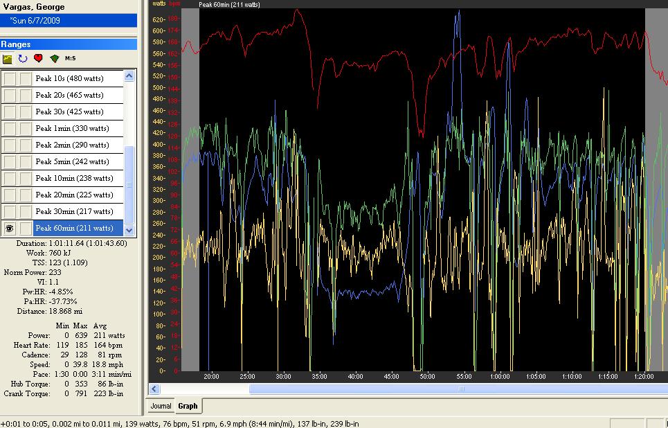 Above is a screen shot from Training Peaks. You will see on the left a small frame that shows a time frame and corresponding wattage. The only thing missing to make the data quantifiable is my weight. I weighed 150 lbs yesterday which is 68.04 kg.