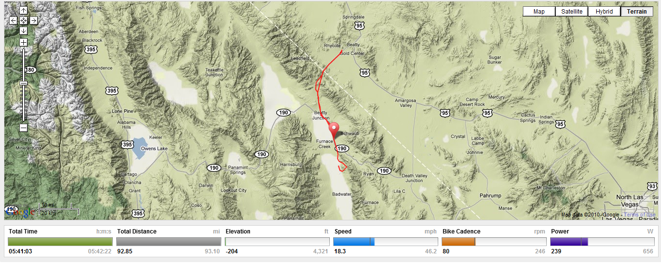 On February 26, I finished first at the 2011 Spring Death Valley Double Century blog report here. I then continued to ride hard and rode 500 miles within seven days. Within a week of that feat I was sick. It was the first time I had ridden 500 miles in a week since 2007 when I was training for Race Across America (RAAM). The first part of March was a wash. My son was sick, my co-workers were sick and customers were sick. I couldn’t avoid it. My immune system was suppressed and BAM! I got sick. I had to sit out of Hell’s Gate Hundred because I was sick. Just recently, after 2011 Mount Laguna Bicycle Classic, April 16, blog report here. I tried to ramp up again got up to 350 miles for the week and BAM! got sick. So I had to pull back again. That cold has lasted through Breathless Agony with a nagging cough. Oh well it is still early in the season and I have bigger fish to fry than Breathless ‘Agony namely the Furnace Creek 508. The Death Valley Double Century, Hell’s Gate Century, Mount Laguna Bicycle Classic and the Furnace Creek 508 are events put on by AdventureCorps.