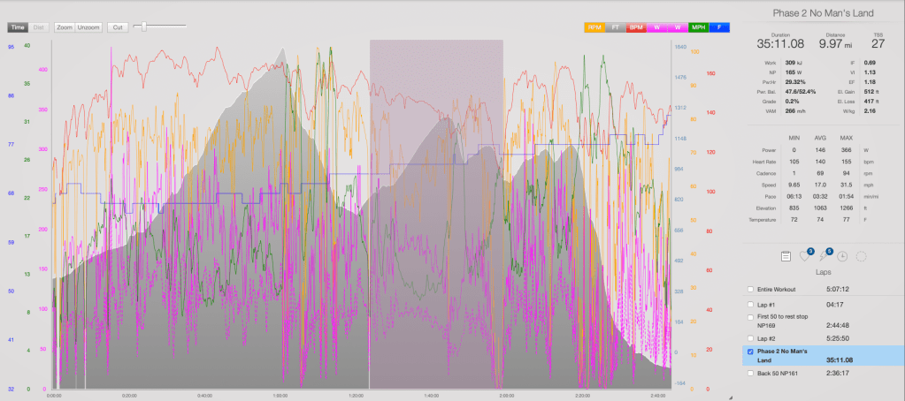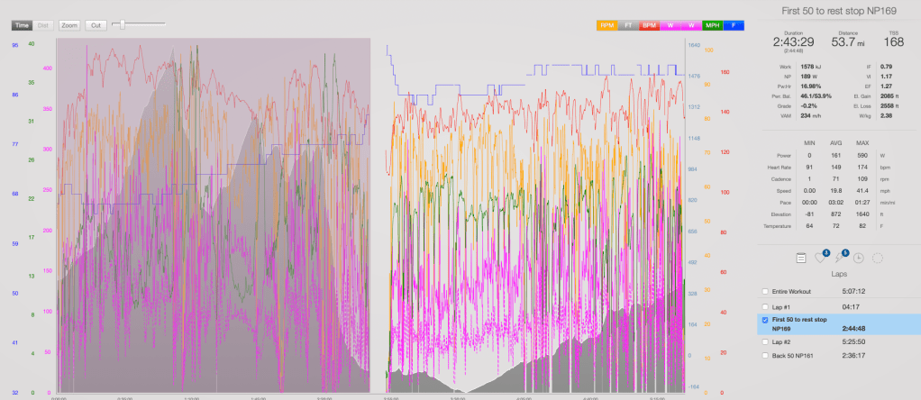 First 2 hours 43 minutes – 53 miles 189 watts Normalized power (2.8 w/kg)