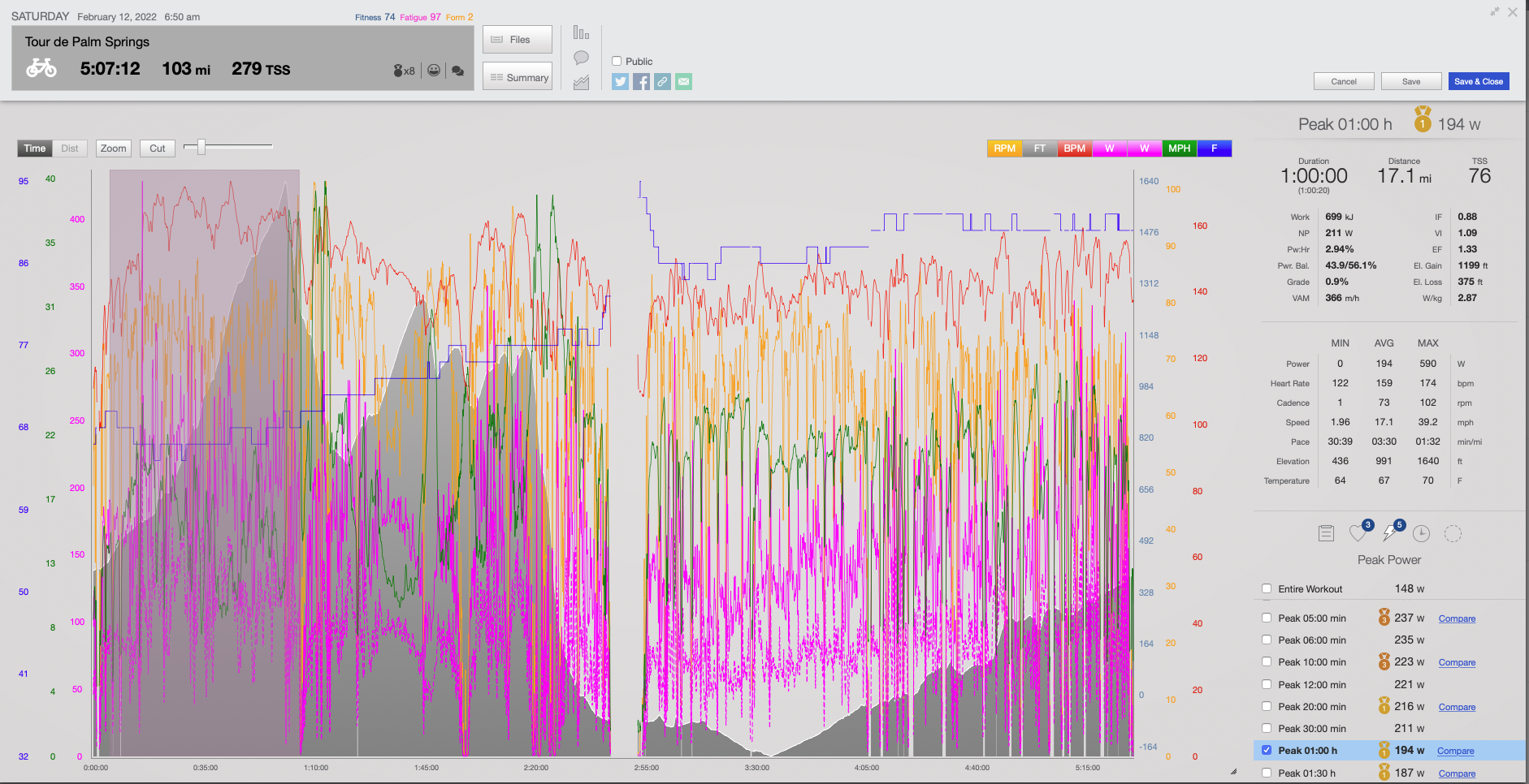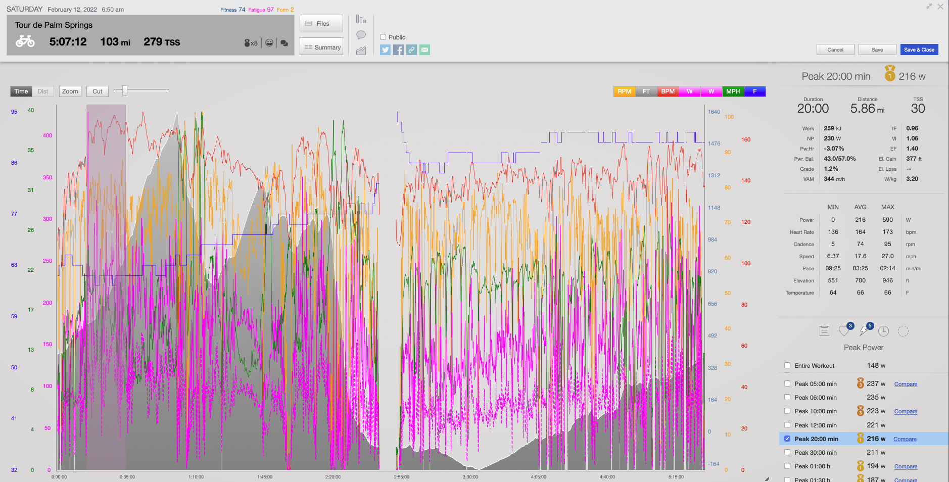 20 mins 230 w NP (3.4 w/kg) HR 164 bpm avg 173 bpm max 17.6 mph avg30 mins 225 w NP (3.3 w/kg) HR 164 bpm avg 174 bpm max 16 mph avg60 mins 211 w NP (3.1 w/kg) HR 159 bpm avg 174 bpm max 17.1 mph avg35 minutes of easy pedaling 165 watts NP HR 140 bpm avg 155 bpm max 17 mph avg