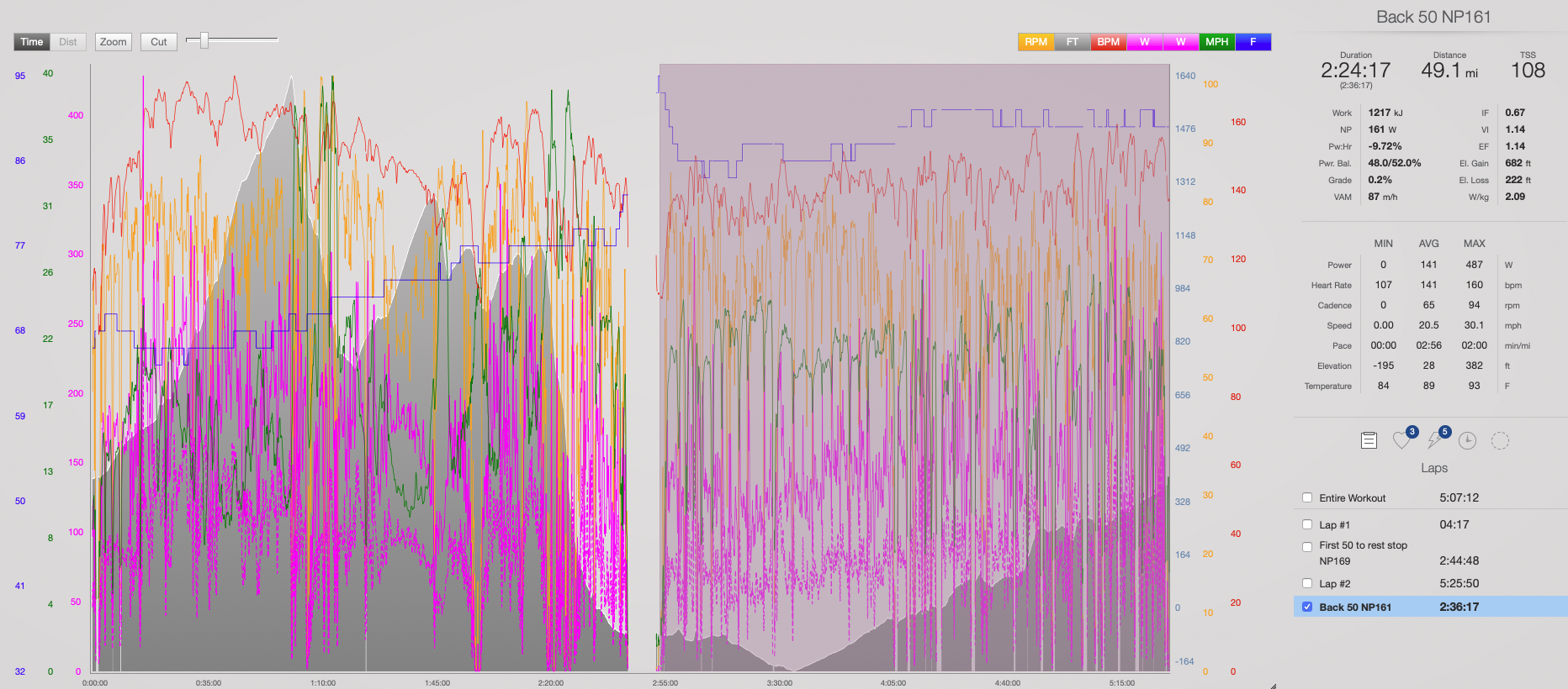 2 hours 24 minutes 49 miles 161 Watts Normalized Power (2.4 w/kg)