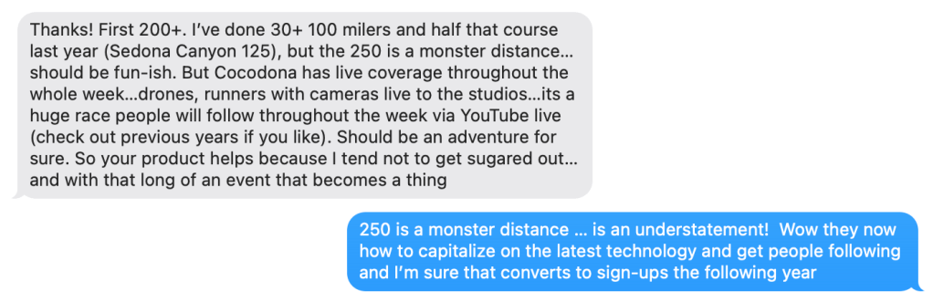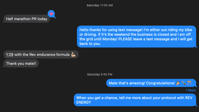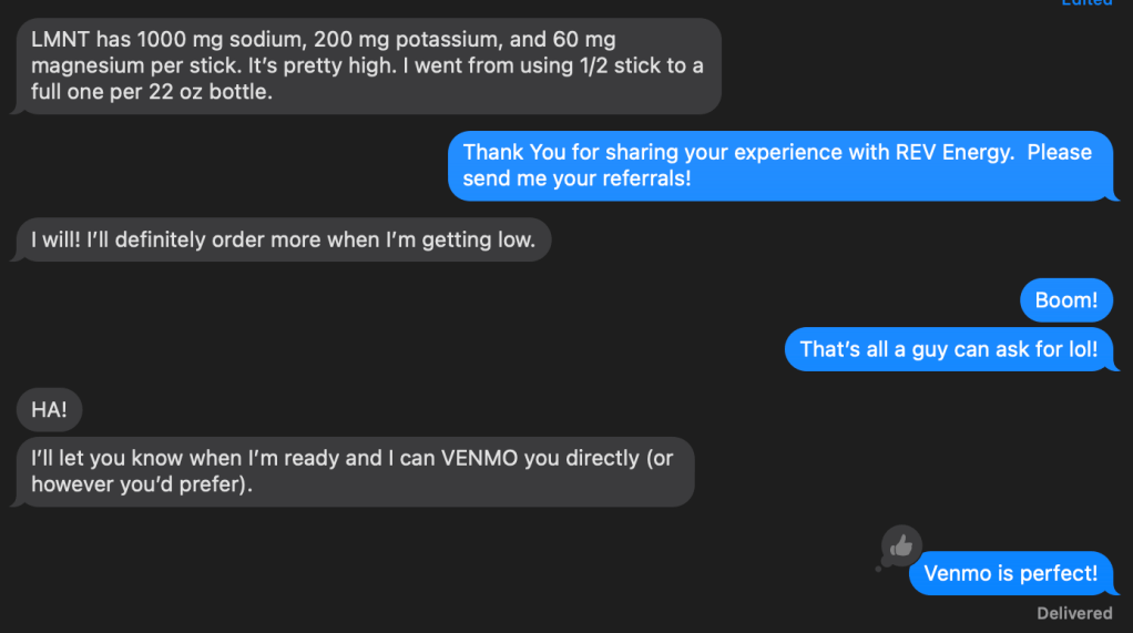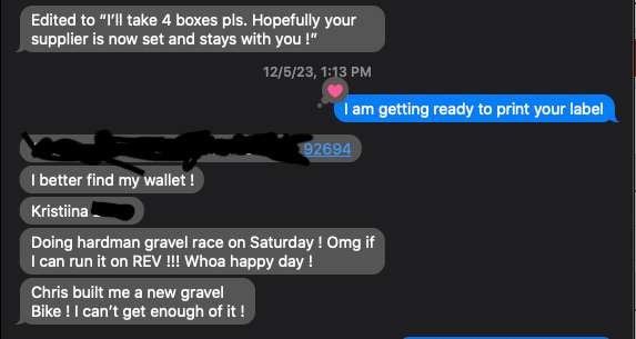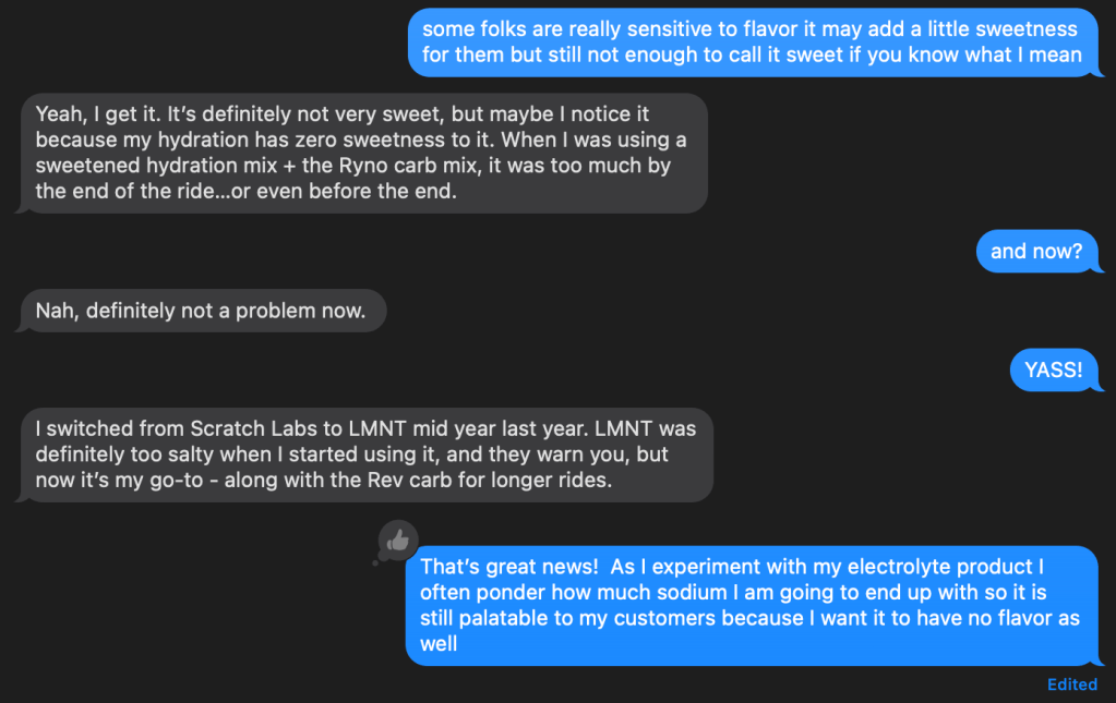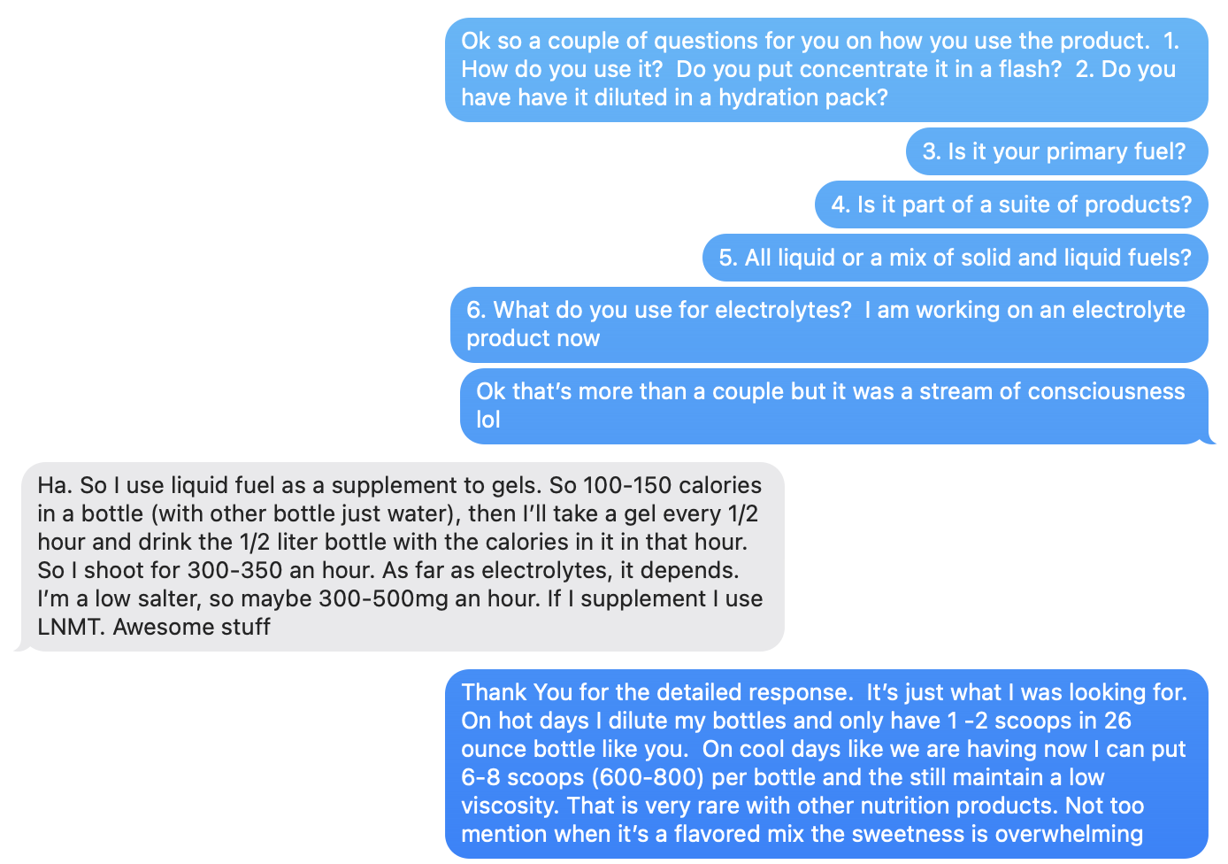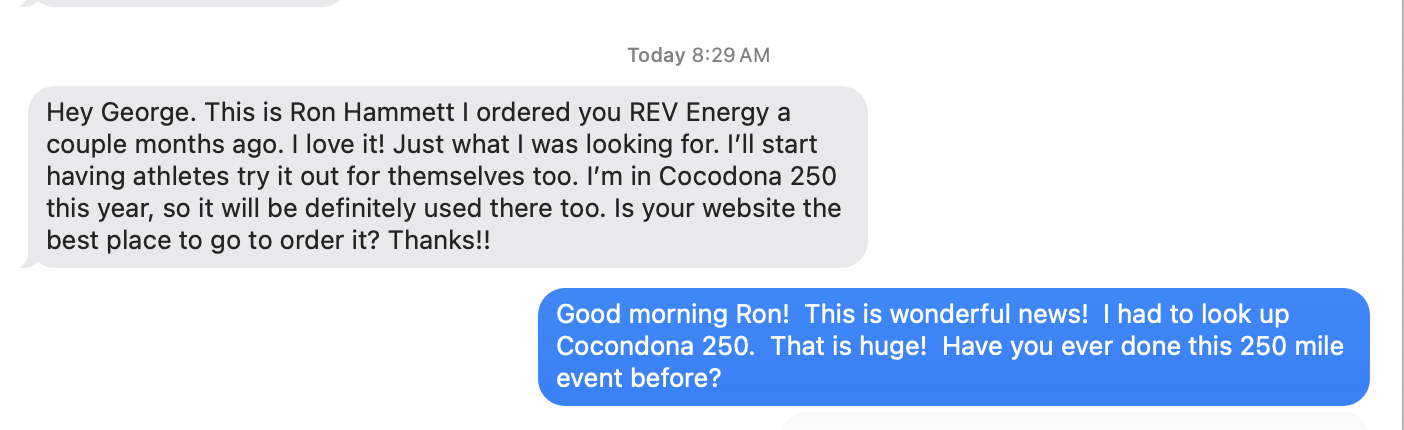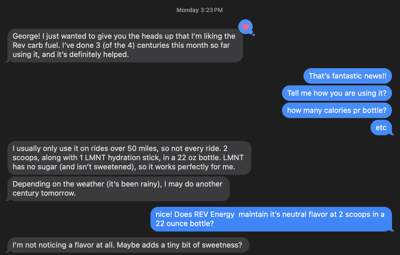Earlier this month (Jan 2024) I sent my new customer a container of REV Energy. He rides consistently with a group of 3-4 other mates. Prior to our discussion he didn’t really think much about planning his nutrition for his rides. He would have some calories in his bottles, mainly electrolytes, and eat his calories from pocket food he would take along. We discussed a strategy of more calories in the bottle so that he could just sip sip sip his calories all day without having to eat solid foods. I recommended concentrating the fuel in his bottles and how to use REV Energy to achieve this new fueling strategy. I advised using a minimum of 2 scoops of REV Energy (200 calories) per bottle but going up to as many as 6 scoops (600 calories) per bottle.